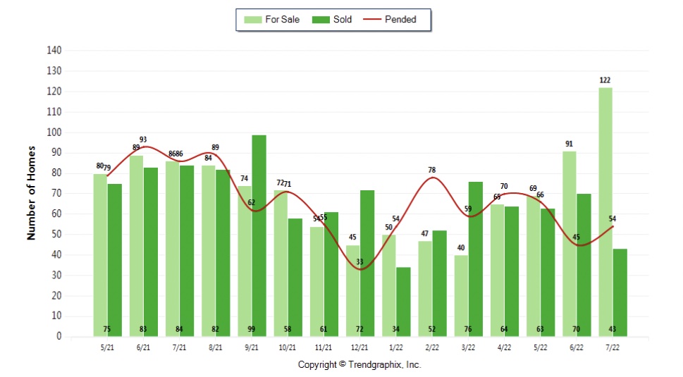 Average sales price for Palos Verdes homes sold in July decreased to $2,799,000 compared to $3,029,000 in June, and increased from the $2,482,000 in July 2021. Price per square foot for Palos Verdes houses that sold/closed escrow in July decreased to $926 from $982 in June. Average days on market in July was 22 days which increased from 14 days in June. Months of inventory (months it would take to sell existing inventory at the current rate of sale) was 2.8 months in July which increased from 1.3 months in June for Palos Verdes homes for sale. A “normal” or balanced market is considered 3 months of inventory and Palos Verdes real estate “months of inventory” is still lower indicating the continuing demand for Palos Verdes homes. Inventory of Palos Verdes homes for sale has increased dramatically in the last two months. Entire charts can be accessed by clicking here or on the “Statistics” tab above.